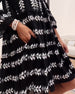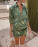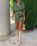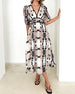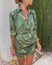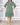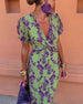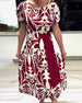 Elegant lövtryckt A-linje klänning med djupt V och puffärm