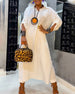 SPECIFIKATIONER Klänningstyp: Denim Klänning längd: Maxi Stil: Vardag Material: Denim, Polyester Sammanhang: Vardag Urringning: Slag Mönstertyp: Enfärgad Typ av ärm: Vanlig ärm Ärmlängd: Halvärm Passform: Lös Säsong: Vår, Sommar, Höst Förpackningen innehåller: 1 x Klänning STORLEKSTABELL(cm) Storlek Byst Armlängd Midjeomkret...