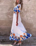 SPECIFIKATIONER Stil: Enkel, Elegant Material: Bomullsblandningar Klänningstyp: A-linje Klänning längd: Maxi Urringning: V-hals_V Mönstertyp: Tryckt Typ av ärm: Vanlig ärm Ärmlängd: 3/4 ärm Detaljer: Blandade Passform typ: Vanlig Säsong: Vår, Sommar Tillfälle: Dagligen, Semester Paketet innehåller: 1 x Klänning STORLEKSTABELL(cm) Storle...