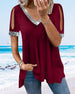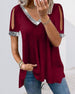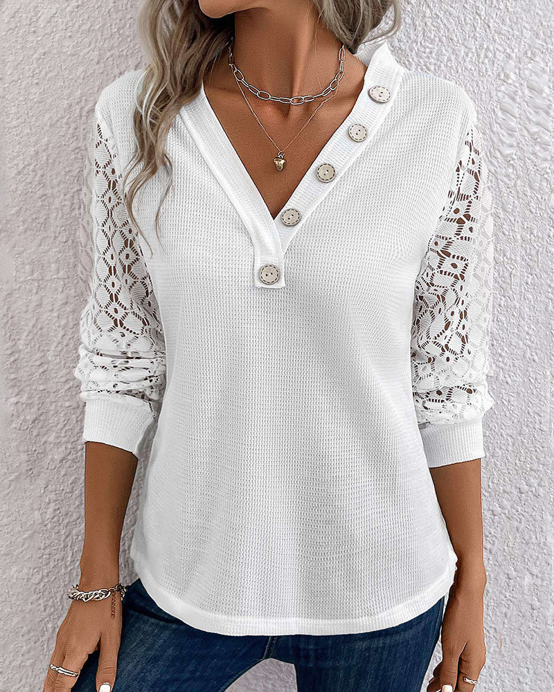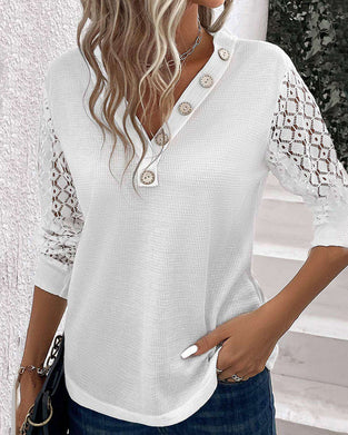 SPECIFIKATIONER Topptyp: T-shirt Stil: Elegant Material: Spets, Polyester Tillfälle: Dagligen Urringning: V-hals_V Mönstertyp: Färgblock Typ av ärm: Raglan ärm Ärmlängd: Kortärmad Passform typ: Vanlig Säsong: Vår, Sommar, Höst Detaljer: Lappverk, Knappar, Spets Paketet innehåller: 1 x T-shirt STORLEKSTABELL(cm) Storlek Byst Längd ...