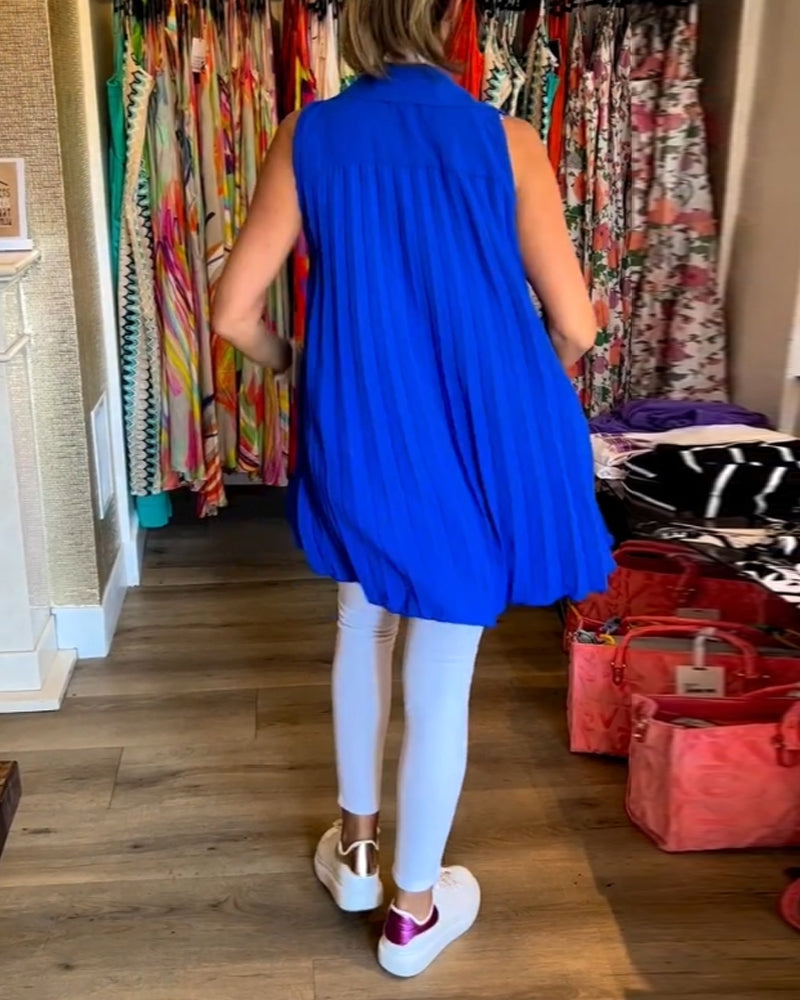 FUNKTIONER Denna ärmlösa topp har en enfärgad färg som erbjuder en enkel men elegant look. Frånvaron av ärmar gör den bekväm och perfekt för varmt väder. Den klassiska nedfällbara kragen lägger sofistikering till sin avslappnade stil. Det subtila vecket på baksidan förstärker dess design utan att överväldiga dess minimalistiska charm. Design...