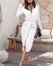 SPECIFIKATIONER Stil: Elegant, Fest, Sexig, Kontor Material: Bomullsblandningar, Spets Klänningstyp: Slå in Klänning längd: Knälängd Urringning: V-hals_V Mönstertyp: Enfärgade Typ av ärm: Vanlig ärm Ärmlängd: Långärmad Detaljer: Lappverk, Slits, Blandade, Spets Passform typ: Vanlig Säsong: Vår, Sommar, Höst, Vinter Tillfälle: Dagligen, Arbete...