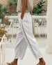 EGENSKAPER: Kategori: Klänning Stil: Boho, Semester, Elegant Material: Bomull Halsringning: V-ringad Ärmtyp: Ärmlös Längd: Knälång Mönstertyp: Enfärgad Tillfälle: Semester Detaljer: Broderi, Spetsinlägg Passform: Vanlig Säsong: Vår, sommar Paketet innehåller: 1 * Klänning STORLEKSTABELL(cm) Storlek Byst Midjeomkrets Längd S 95 82...