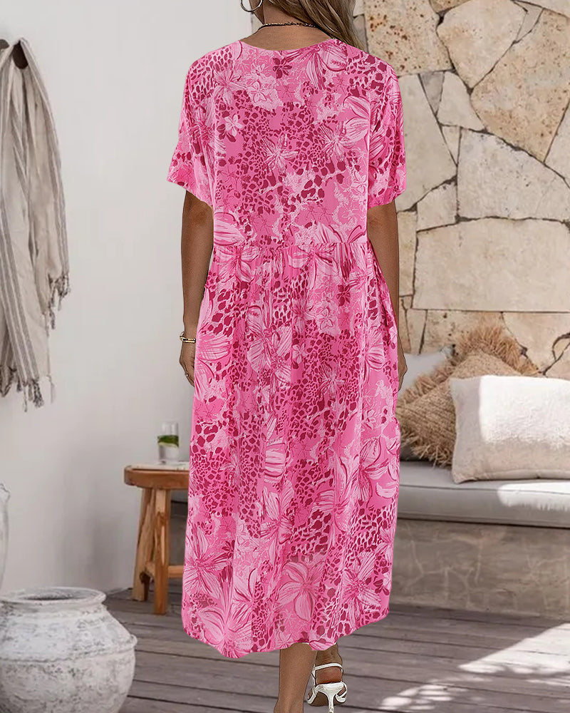 Casual klänning med leopard och färgglatt tryck och djupt V